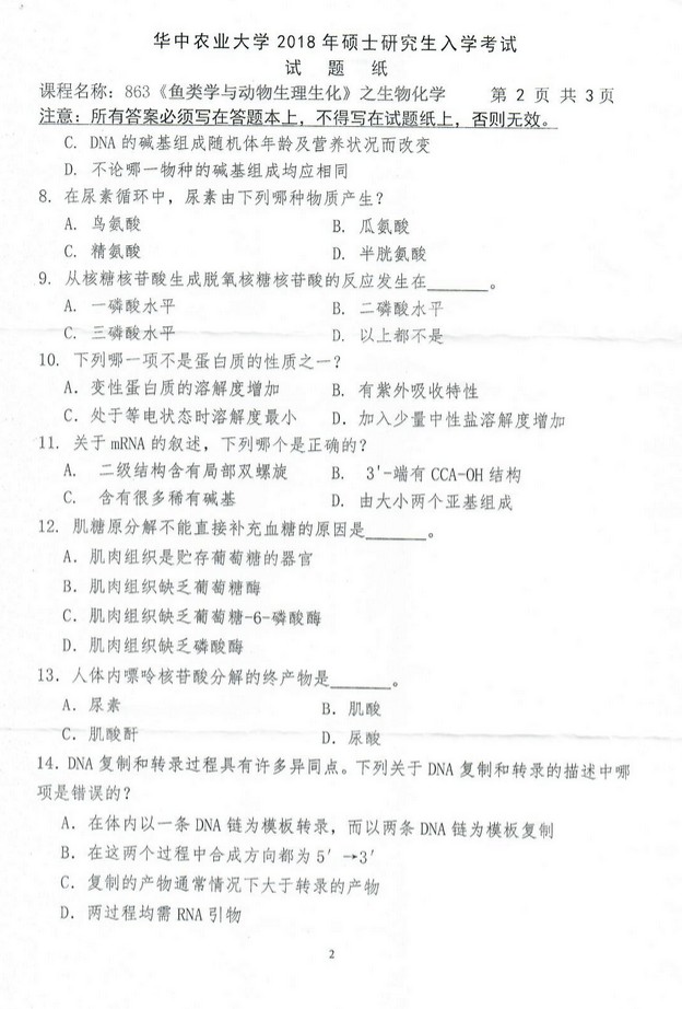 华中农业大学2018年863鱼类学与动物生理生化之生物化学考研试题(2)
