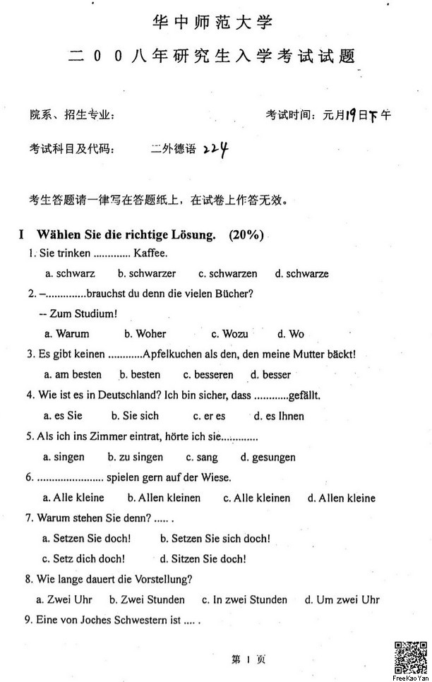 2008年华中师范大学二外德语224考研真题