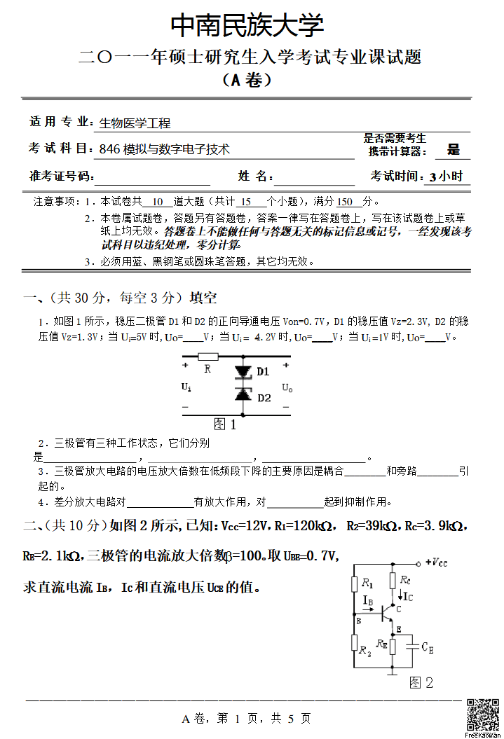 中南民族大学2011年考试试题(846模拟与数字电子技术)A卷