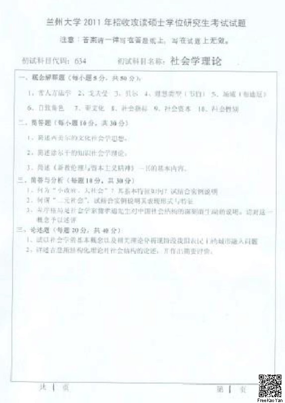 2014年武汉大学考研真题 社会学理论部分(理想途考研) 理论: 一、名词解释 1、亚文化 2、-------- 3、制度化 4、无为 5、群 二、简答 1、迪尔凯姆的知识来源问题 2、葛洪的社会控制思想 3、----------- 4、从功能论和冲突论角度如何看到现代社会的家庭 三、论述 1、---------- ...