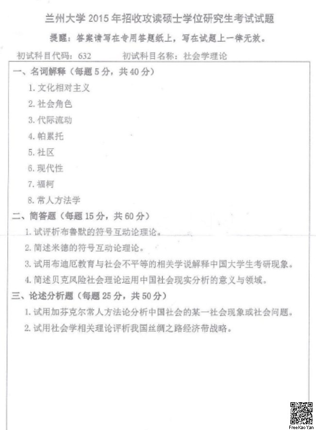 2014年武汉大学考研真题 社会学理论部分(理想途考研) 理论: 一、名词解释 1、亚文化 2、-------- 3、制度化 4、无为 5、群 二、简答 1、迪尔凯姆的知识来源问题 2、葛洪的社会控制思想 3、----------- 4、从功能论和冲突论角度如何看到现代社会的家庭 三、论述 1、---------- ...