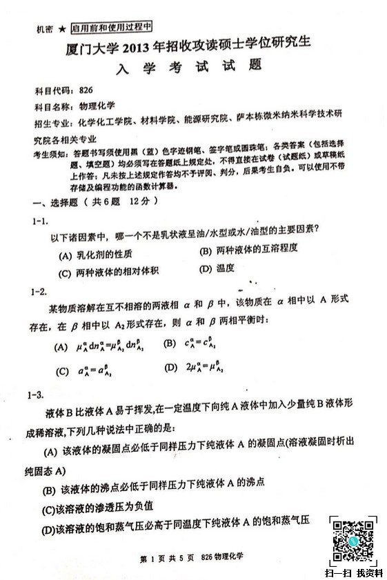 2013厦门大学物理化学826考研真题