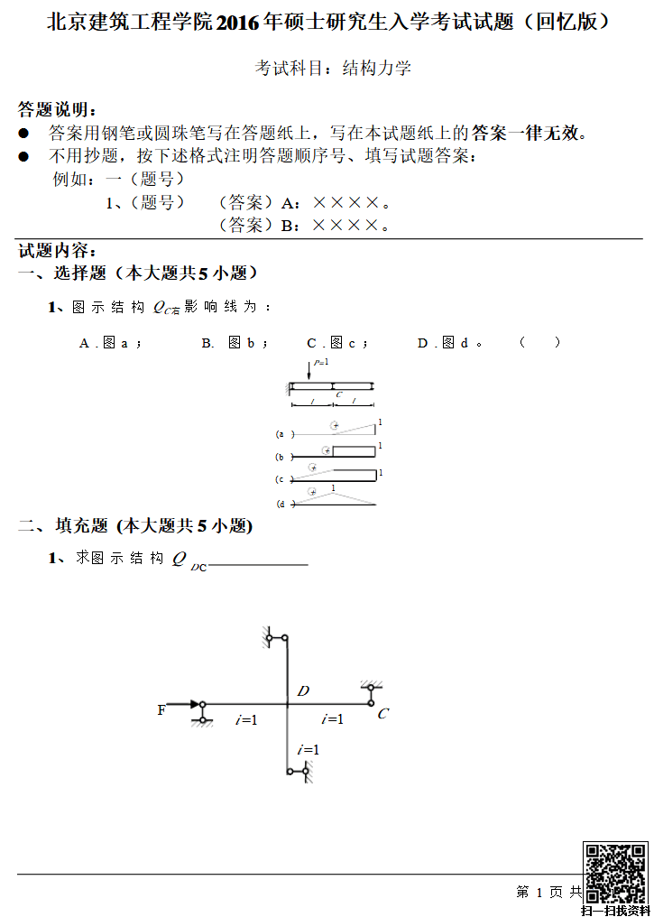 专业课考研资料 本站小编 免费考研网 2020-03-022013年北京工业大学841结构力学考研真题