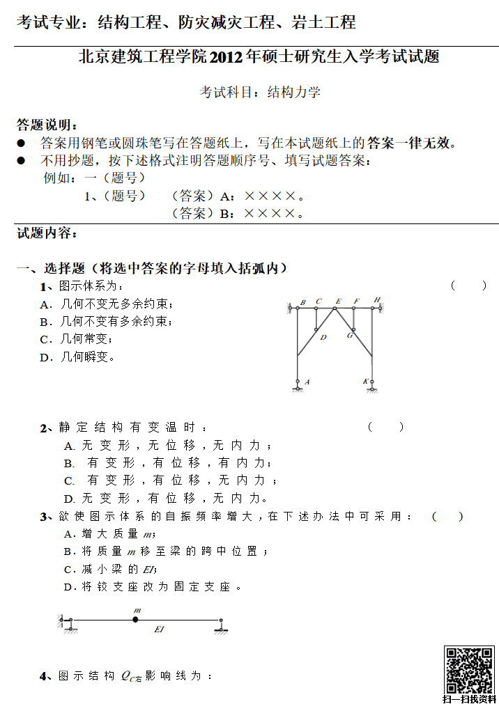 2012年北京建筑大学结构力学研究生初试真题及答案