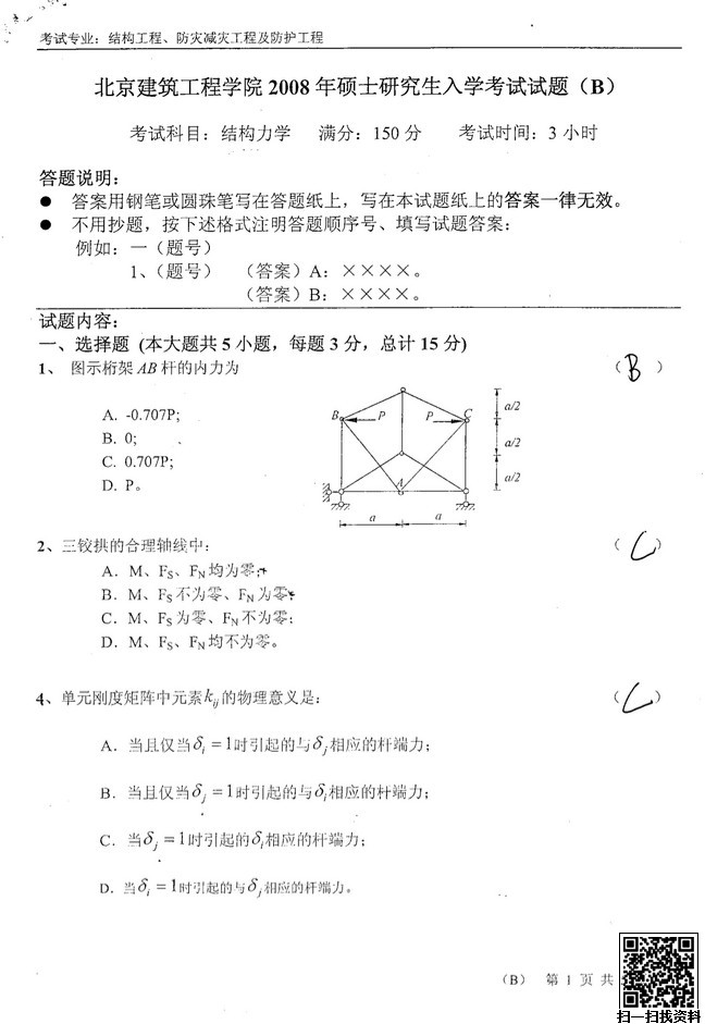 2008年北京建筑大学结构力学研究生初试真题及答案
