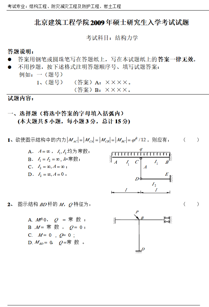 2009年北京建筑大学结构力学研究生初试真题及答案