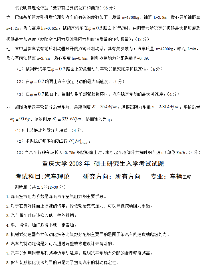 重庆大学2010-2001研究生汽车理论真题题库(3)