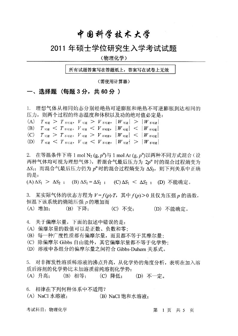 中国科学技术大学2016-2011物理化学考研真题和答案(40)