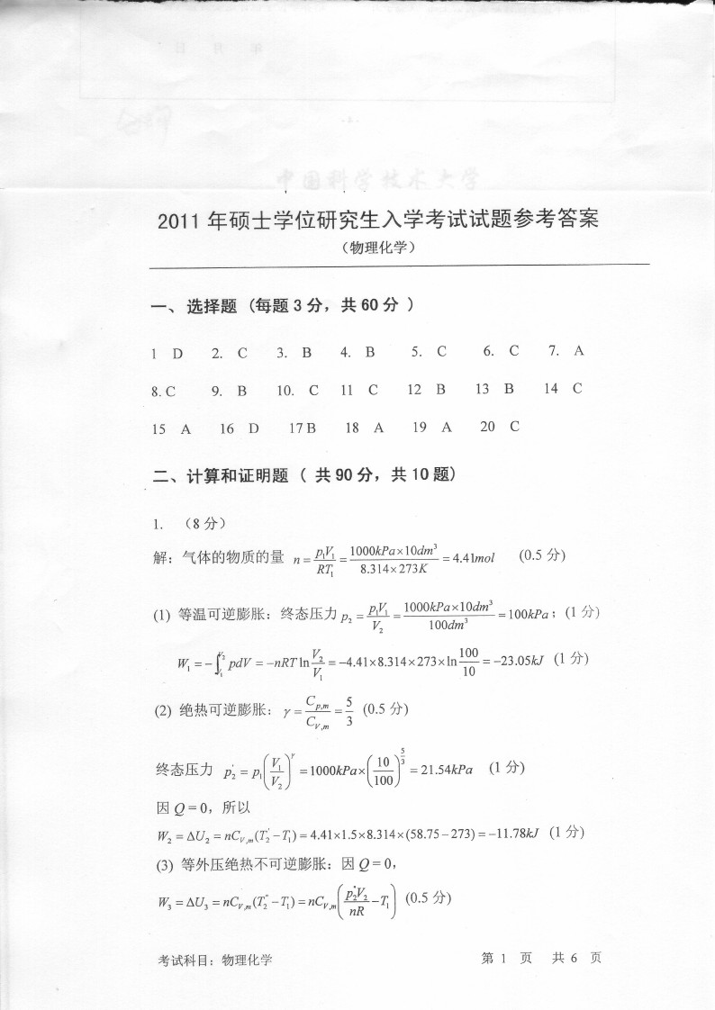 中国科学技术大学2016-2011物理化学考研真题和答案(45)