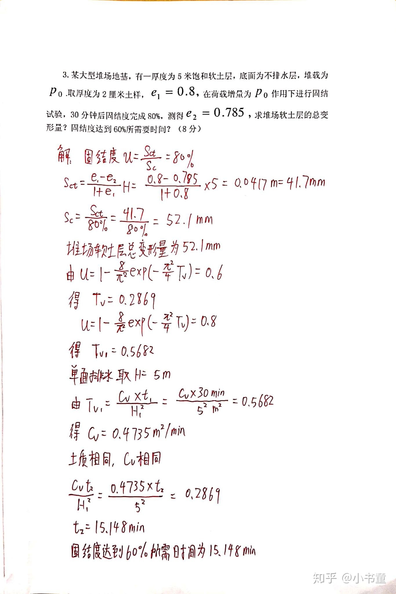 3、看似是考大面积堆土场地的土层压缩,细看才发现是考的固结,挺难的,计算量也不小,要求深入理解,不过我做的感觉有点奇怪。。。。