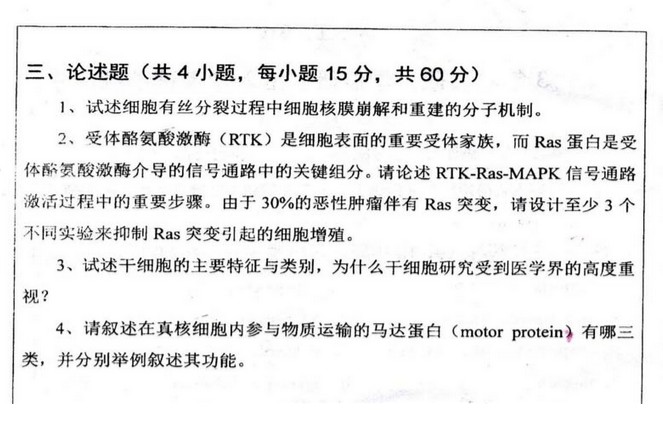 名词解释:(10题每题5) 1、收缩环 2、生殖质 3、胚胎诱导 4、嵌合体 5、细胞拆和 6、多线染色体 简答:(5题每题10,有一道题是论述题忘了是哪道了论述题25) 1癌基因如何使细胞恶性增殖 2、线粒体如何调控细胞凋亡 3、细胞骨架在细胞分裂中的作用及秋水仙碱长春花碱 ...