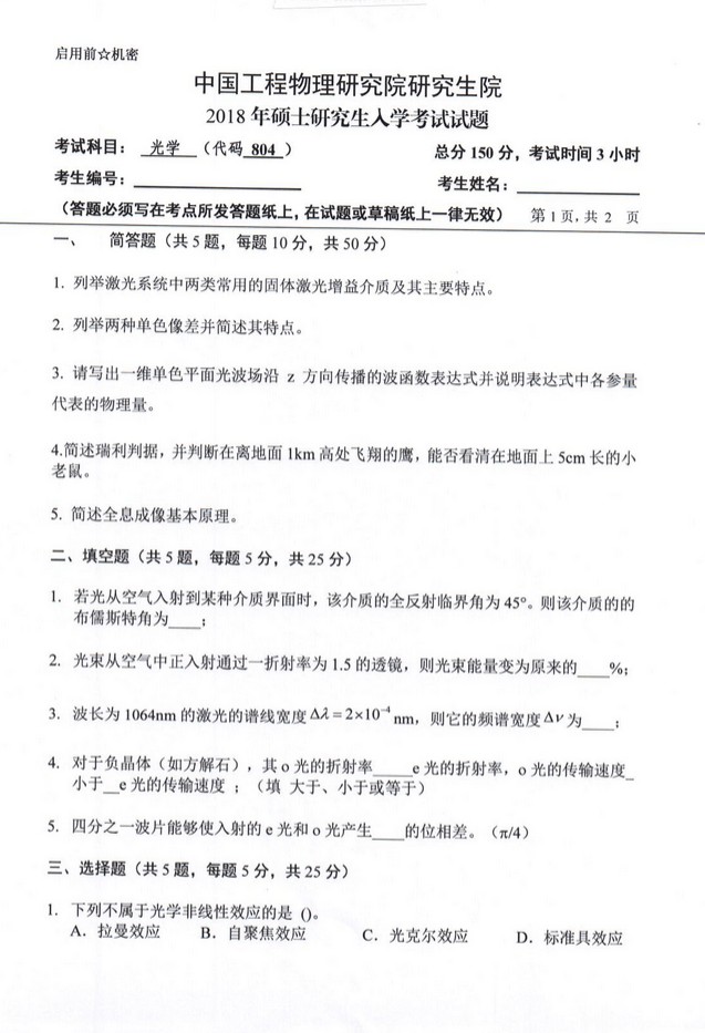 【专业笔试】我选的应用光学,今年应光难出天际,听说固体物理和电路要简单点。首先是三道选择题:(10分/题)