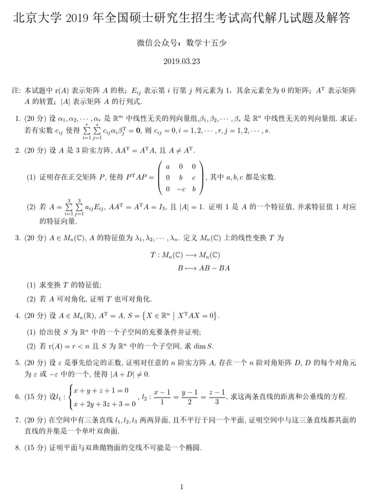北京大学2019年高等代数与解析几何考研试题及解答