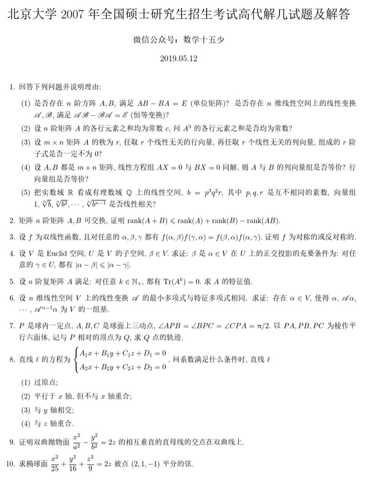 专业课考研资料 本站小编 免费考研网 2020-04-09北京大学2019年高等代数与解析几何考研试题及解答