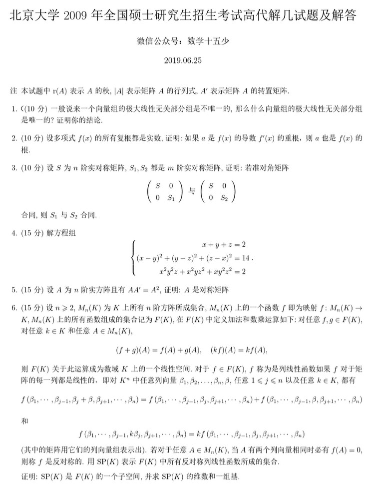 专业课考研资料 本站小编 免费考研网 2020-04-09北京大学2019年高等代数与解析几何考研试题及解答