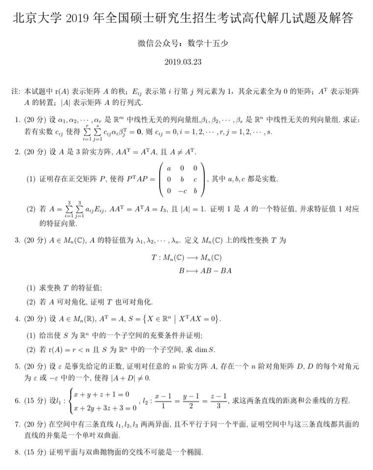 专业课考研资料 本站小编 免费考研网 2020-04-09北京大学2019年高等代数与解析几何考研试题及解答
