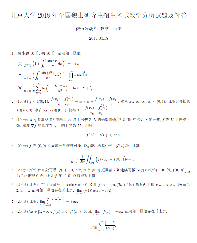 专业课考研资料 本站小编 免费考研网 2020-04-22北京大学2019年数学分析试题及解答