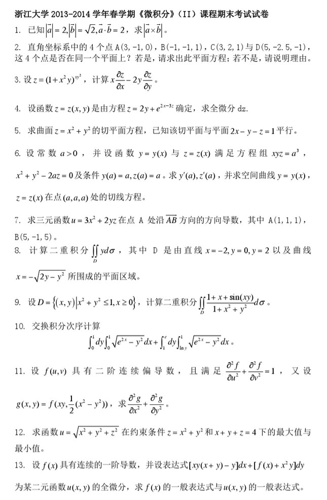 浙江大学2013-2014微积分期末考试试卷带手写详细答案