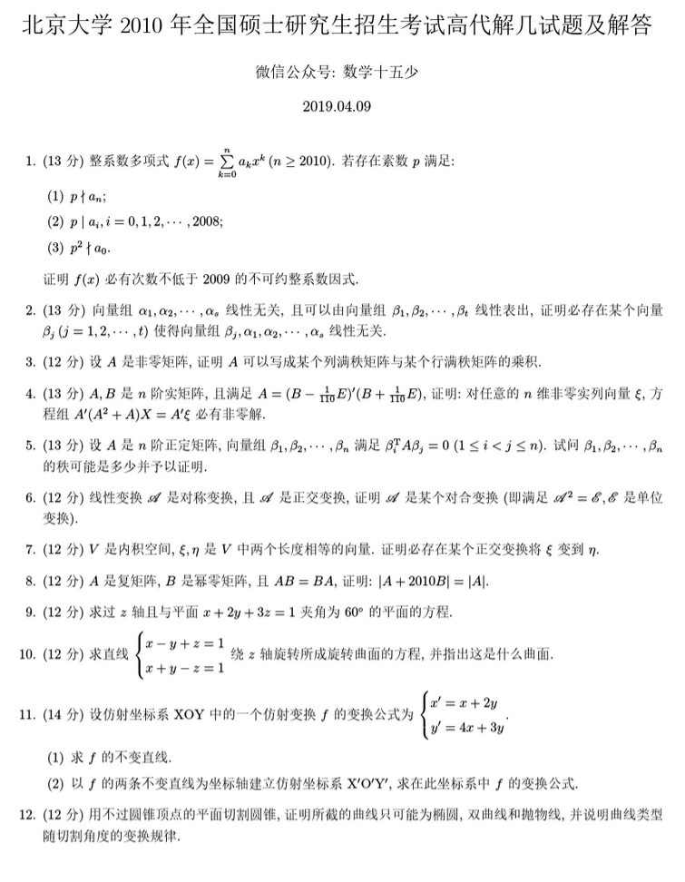 专业课考研资料 本站小编 免费考研网 2020-04-09北京大学2009年高等代数与解析几何考研试题及解答