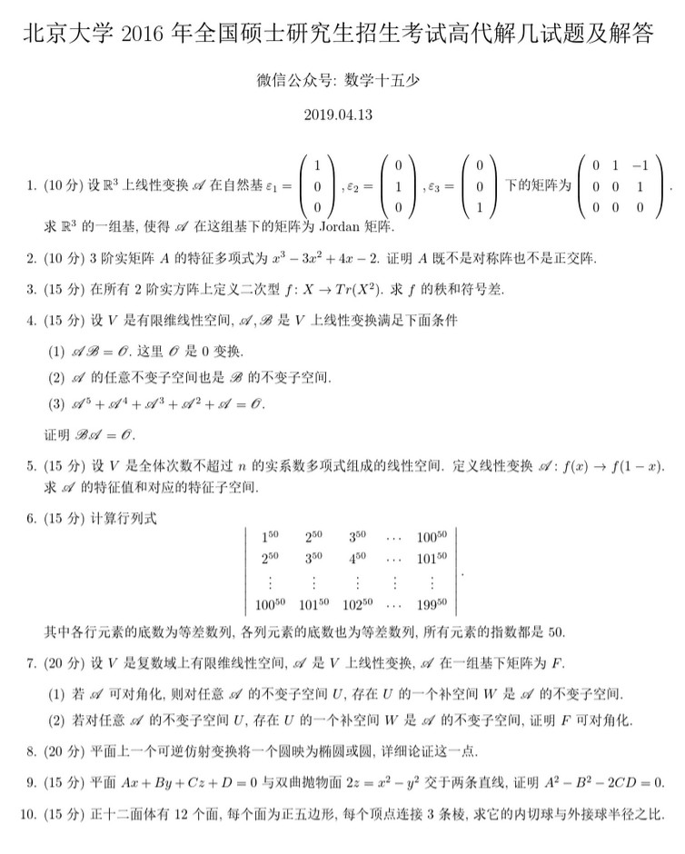专业课考研资料 本站小编 免费考研网 2020-04-22北京大学2019年高等代数与解析几何试题及解答