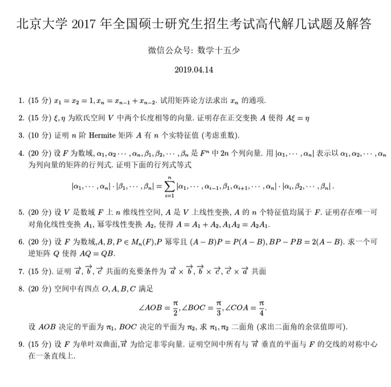 专业课考研资料 本站小编 免费考研网 2020-04-22北京大学2019年高等代数与解析几何试题及解答