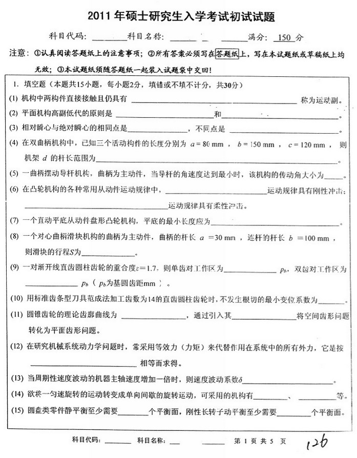 2011中国矿业大学机械原理专业课考研真题