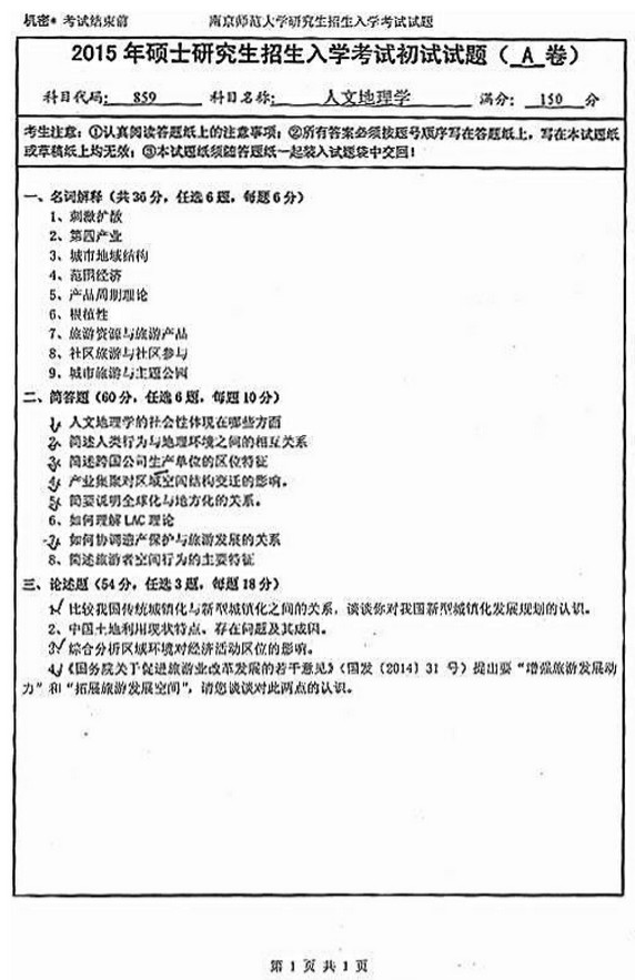 南京师范大学地理科学学院人文地理学历年考研真题汇编(10)