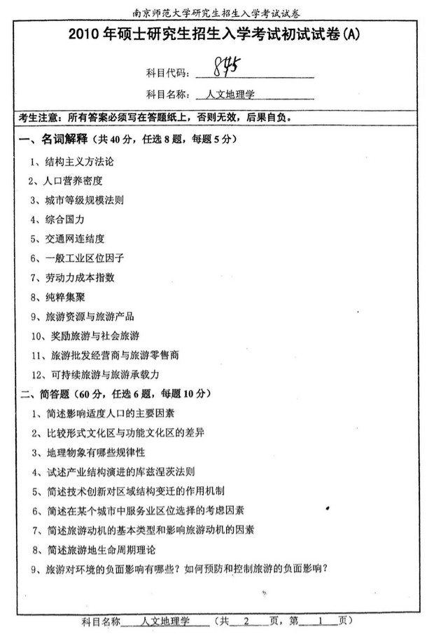南京师范大学地理科学学院人文地理学历年考研真题汇编(4)