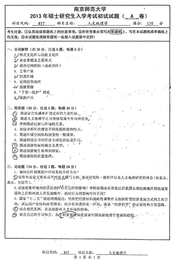 南京师范大学地理科学学院人文地理学历年考研真题汇编(8)