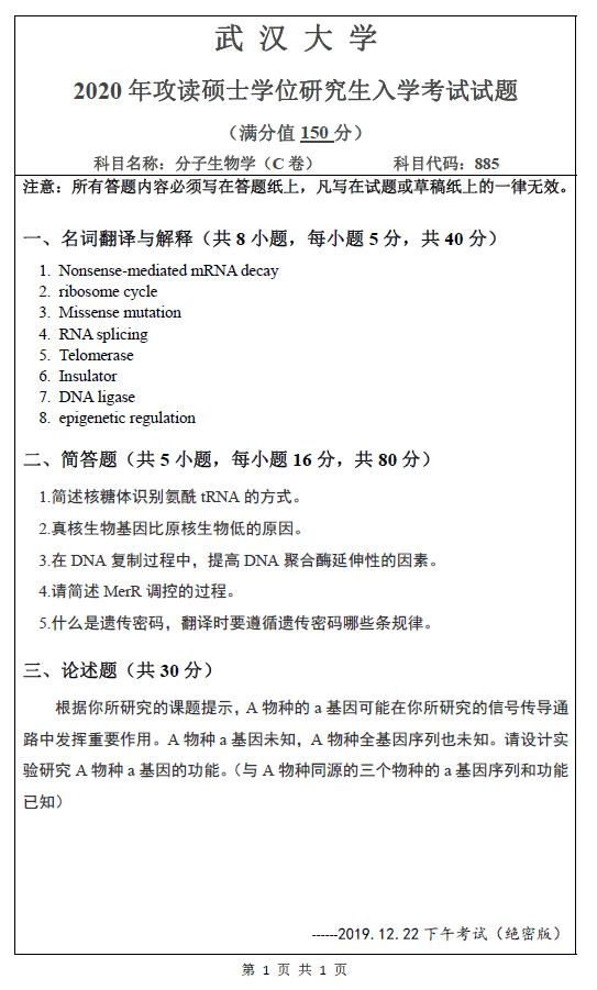 考研分数线 本站小编 免费考研网 2020-04-25 武汉大学2010年细胞生物学