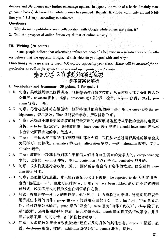 南开大学2011MTI翻译硕士真题翻译硕士英语答案