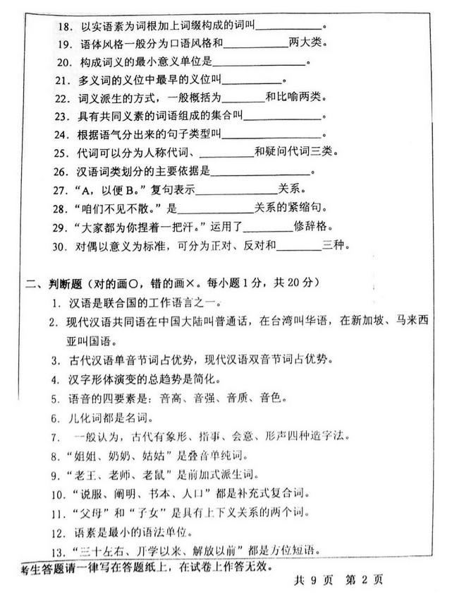 一、填空题 所谓递归性,是指相同的结构规则可以(),可以由()扩展成层层嵌套的()。 语言系统可以分为()、()、()等子系统。 黏着语又称(),其特点是通过附加多种()来表示各种()。 音质的不同取决于三方面的条件:一是(),二是(),三是()的形状。根据义项之间不同的关系,二元义场又可分 ...