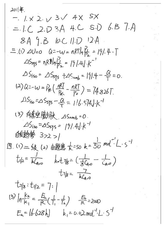 北京航空航天大学2011-2013年物理化学考研真题 答案