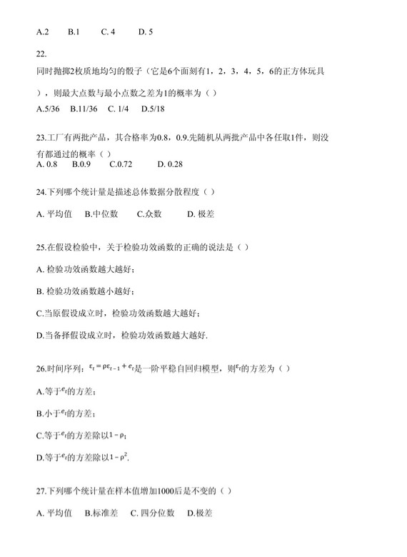 一、 单选题(2分*30=60分) 1、 每道题目有5个选项,即5选1,所以平时复习一定要对知识有清晰的理解。 2、 前3个题每道题目有4小问,即3个题干包括了12个选择题。主要考查总体分布已知(正态)/未知 以及大样本/小样本进行区间估计所选择的统计量。(难点在于第五个选项是以上都不对) 3、 考查到了 ...