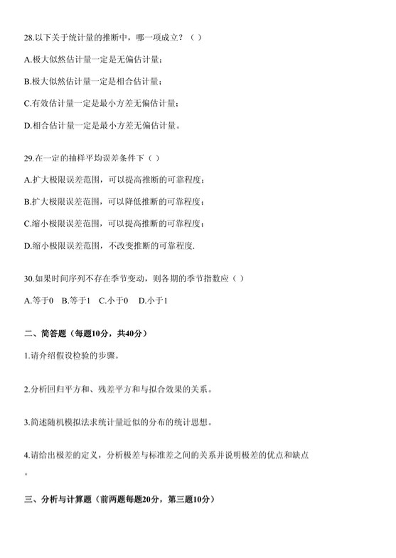 一、 单选题(2分*30=60分) 1、 每道题目有5个选项,即5选1,所以平时复习一定要对知识有清晰的理解。 2、 前3个题每道题目有4小问,即3个题干包括了12个选择题。主要考查总体分布已知(正态)/未知 以及大样本/小样本进行区间估计所选择的统计量。(难点在于第五个选项是以上都不对) 3、 考查到了 ...