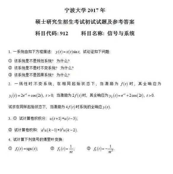 2017宁波大学考研信号系统912试题全解全析