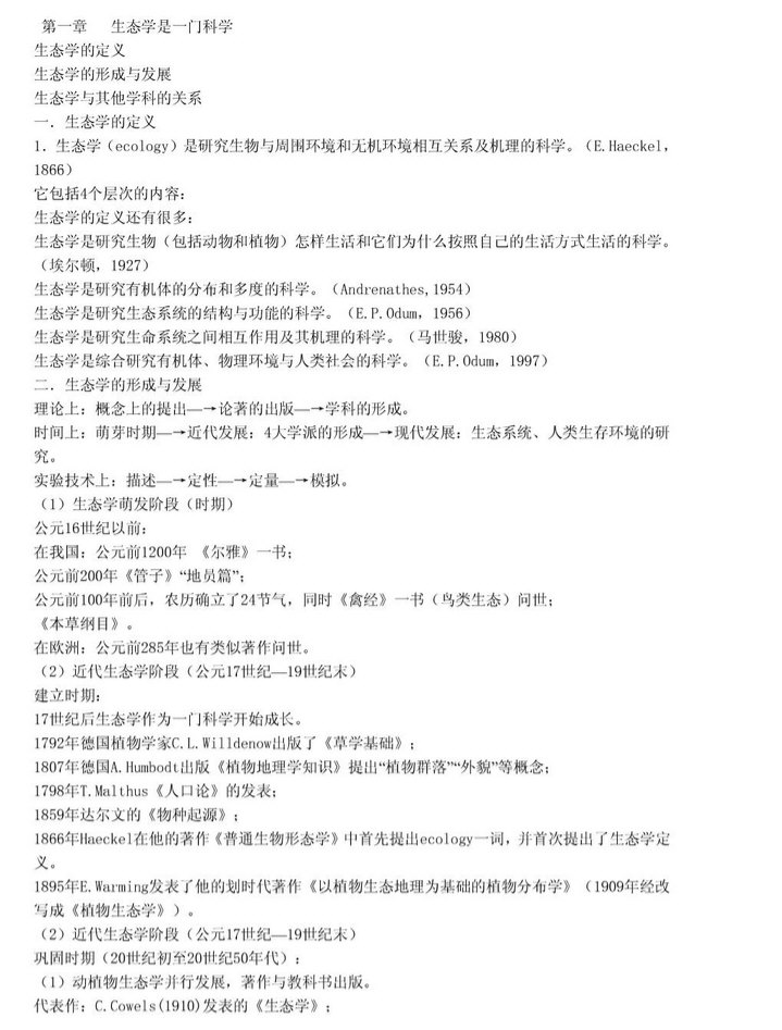 名解1、生态学:研究生物与环境之间相互关系的科学2、森林:森林是由其组成部分生物(包括了乔木、灌木、草本植物以及动物、微生物等)与周围环境(光、水、土壤等)相互作用形成的生态系统3、森林生态系统服务功能:森林生态系统服务功能是指森林生态系统与生态过程所形成及维持的人类赖以生存的自然环境条件 ...