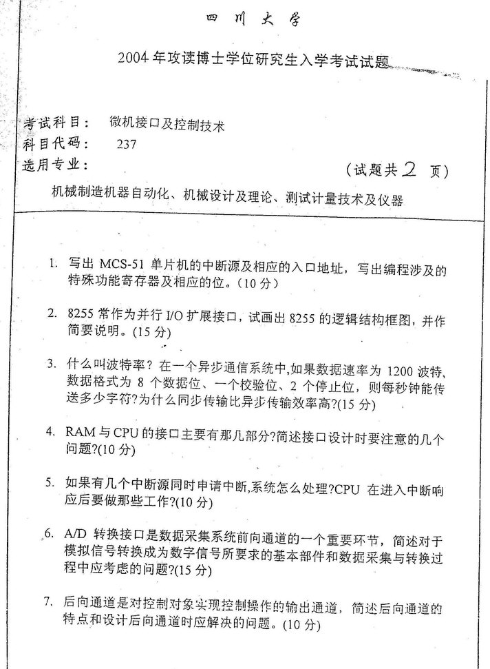 四川大学2011,2008,2006,2004微机接口及控制技术考博试题(4)