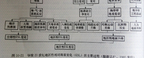 对相对海面变化机制的考虑需要在绝对海面变化机制基础上,再加上海岸地带的各种地面升降运动机制。其中除了较长时间尺度的地壳运动机制以外,还包括多种涉及基岩以上松散沉积层变化和多种人类活动等较短时间尺度的原因机制。