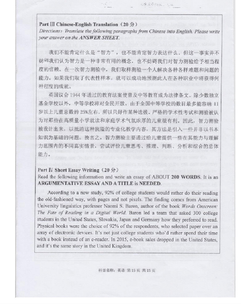 2016-2017年武汉大学博士生英语入学考试真题答案(15)