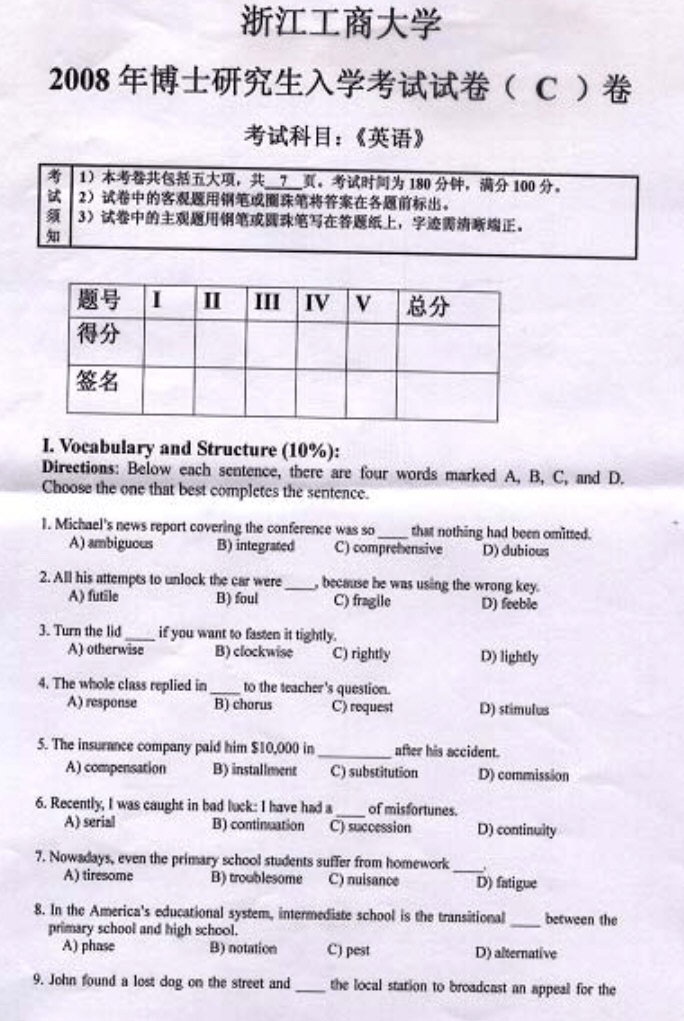 浙江工商大学2008考博英语试题
