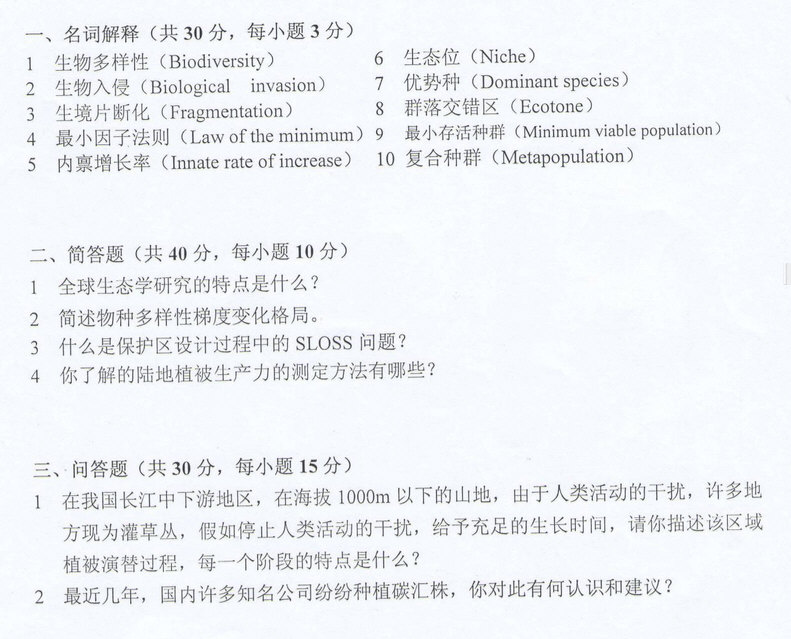 科目名称:生态学