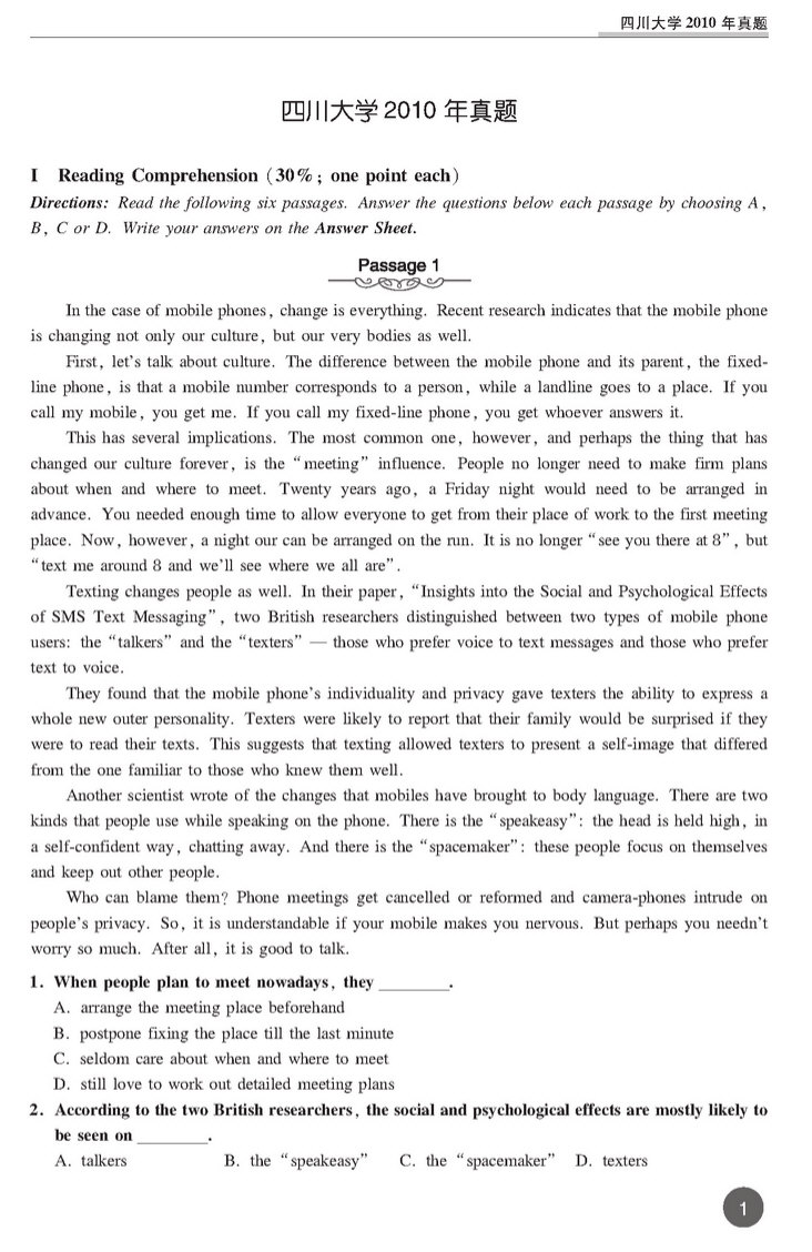 四川大学2010年考博英语真题 打印版 套装专供