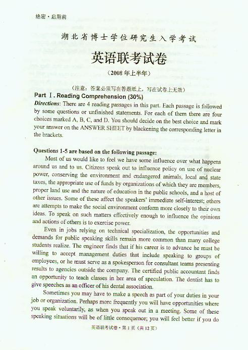 华中科技大学2007-2010年考博英语真题无答案(12)