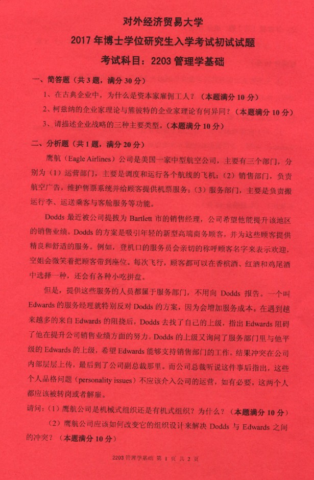 对外经济贸易大学考博真题2007-2017年 管理学基础2202或2203(49)