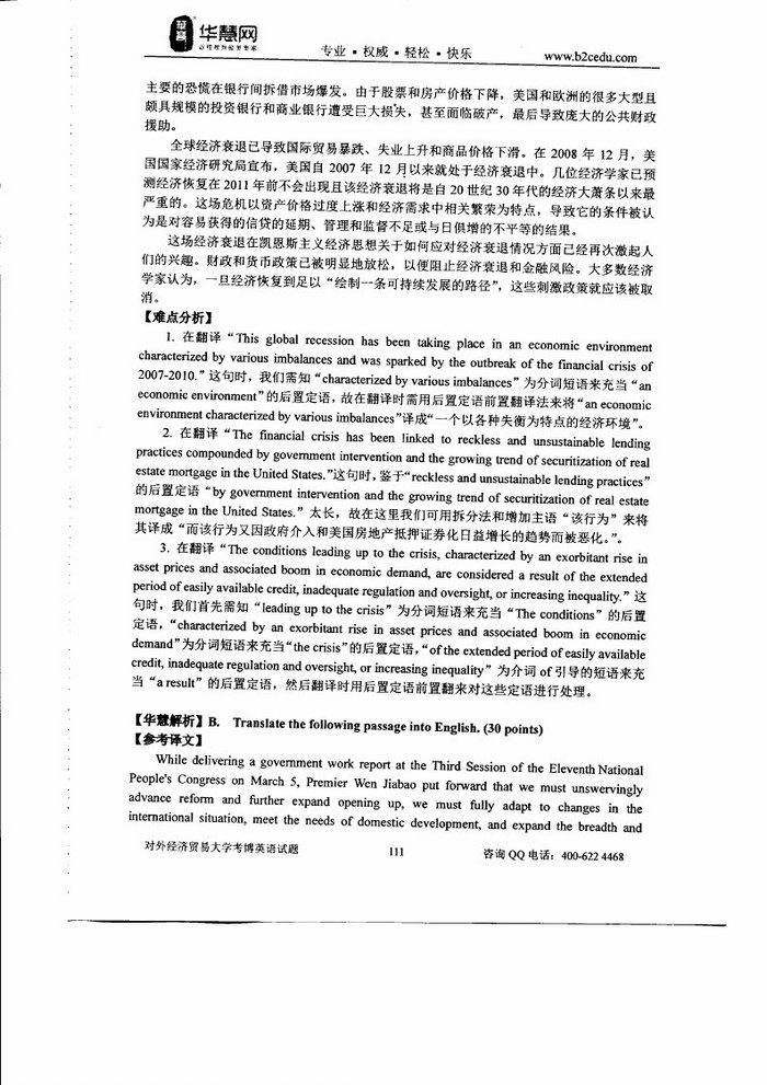 • 对外经济贸易大学2009-2014考博英语真题和答案详解