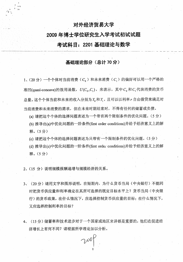 对外经济贸易大学2017,2015-2004经济学基础与数学考博真题(15)
