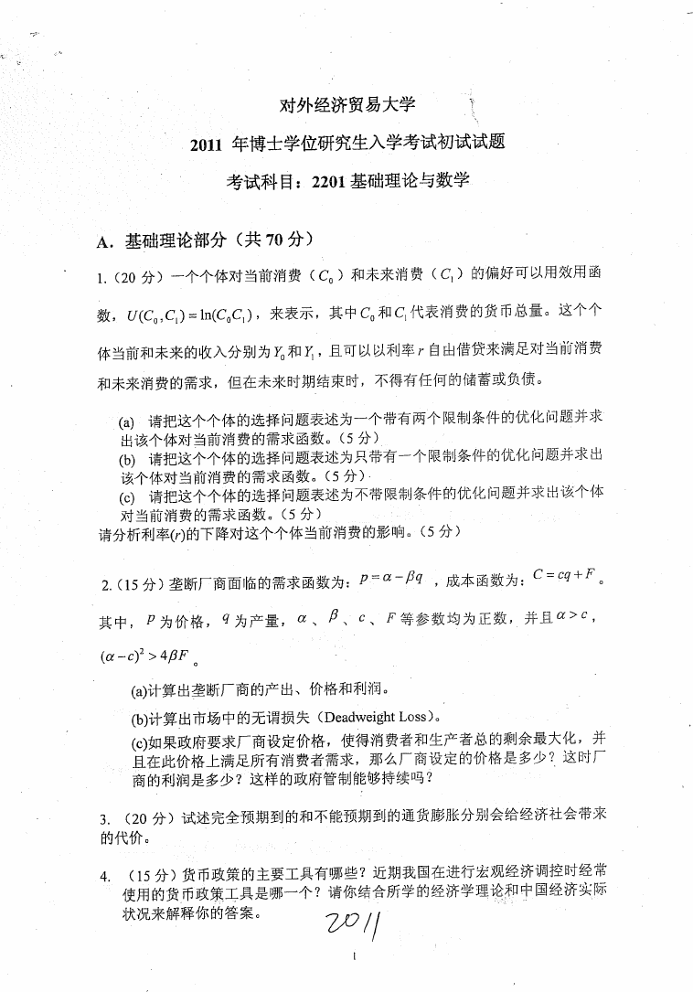 对外经济贸易大学2017,2015-2004经济学基础与数学考博真题(23)