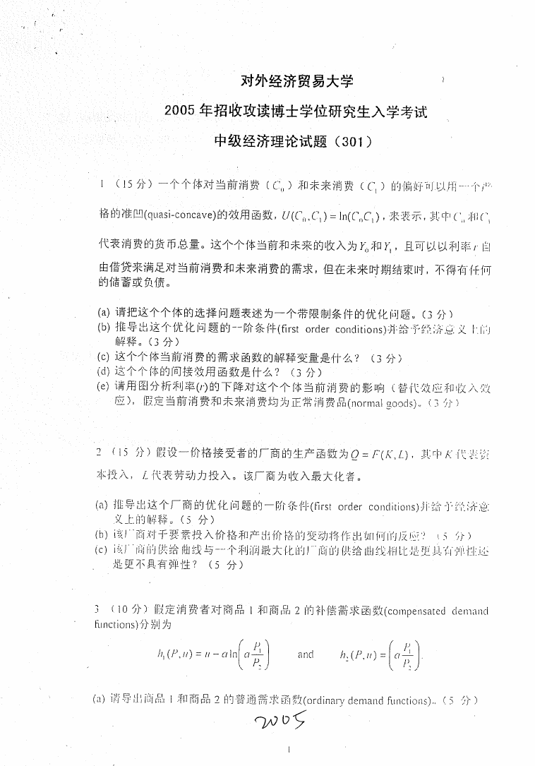 对外经济贸易大学2017,2015-2004经济学基础与数学考博真题(3)