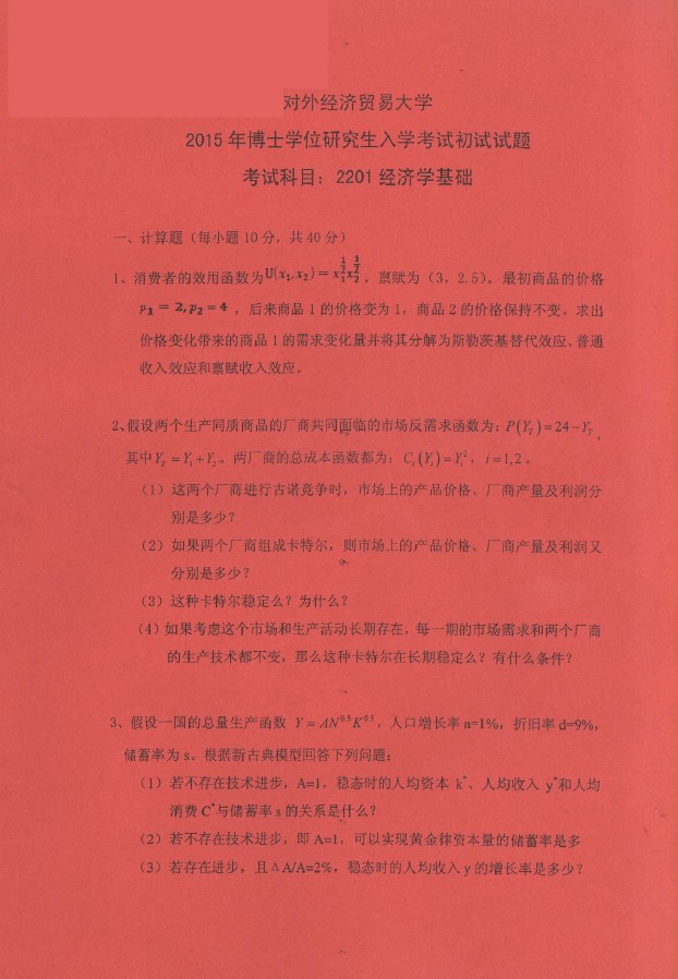 对外经济贸易大学2017,2015-2004经济学基础与数学考博真题(40)